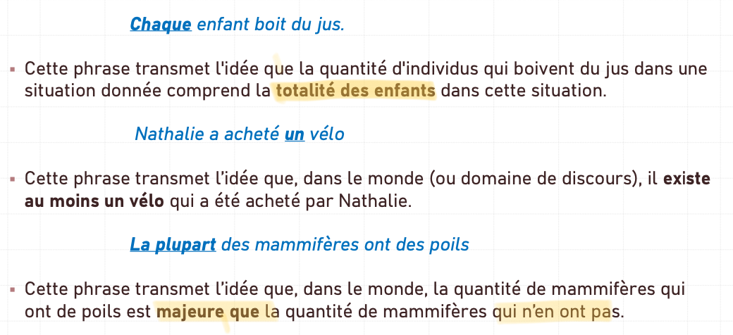 §Ils expriment une quantité d’individus dans un domaine de discours qui ont une certaine propriété.