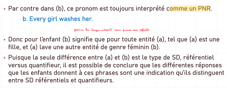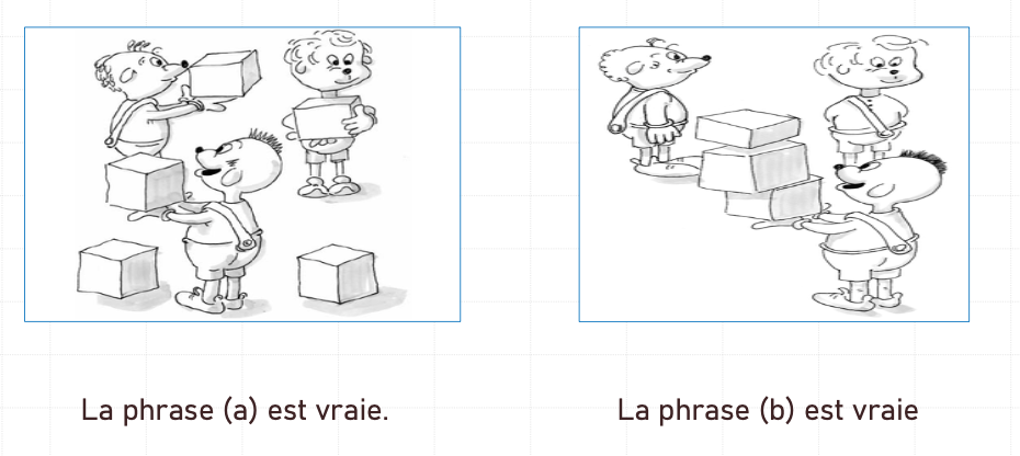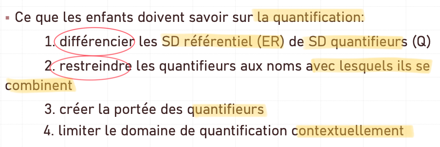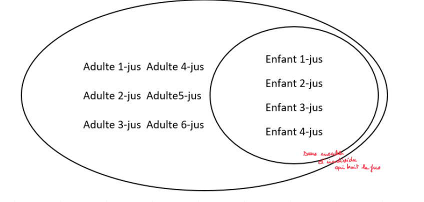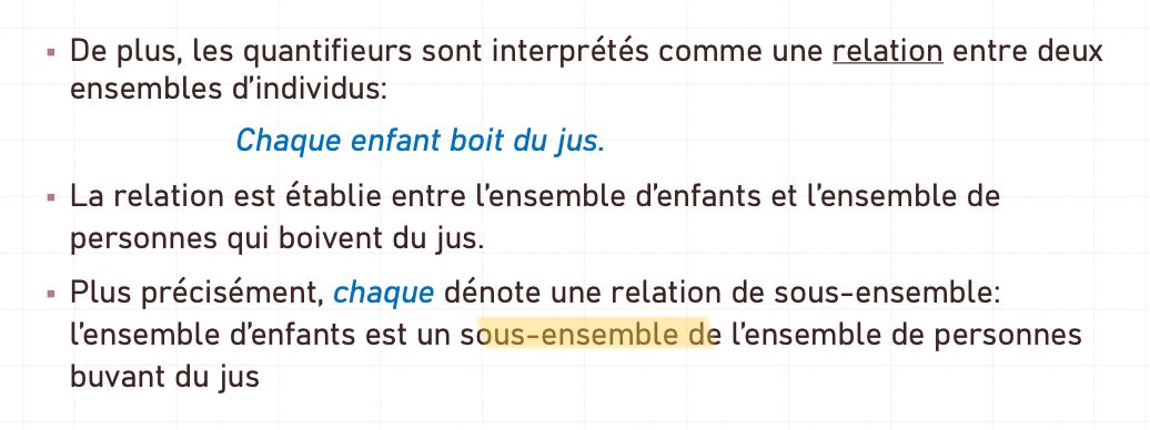 § Si la phase chaque enfant boit du jus est énoncée dans une garderie, le SD chaque enfant réfère aux enfants de la garderie, pas à tous les enfants du monde.