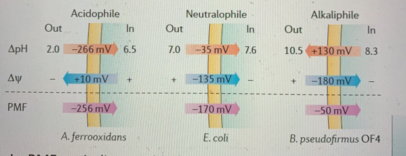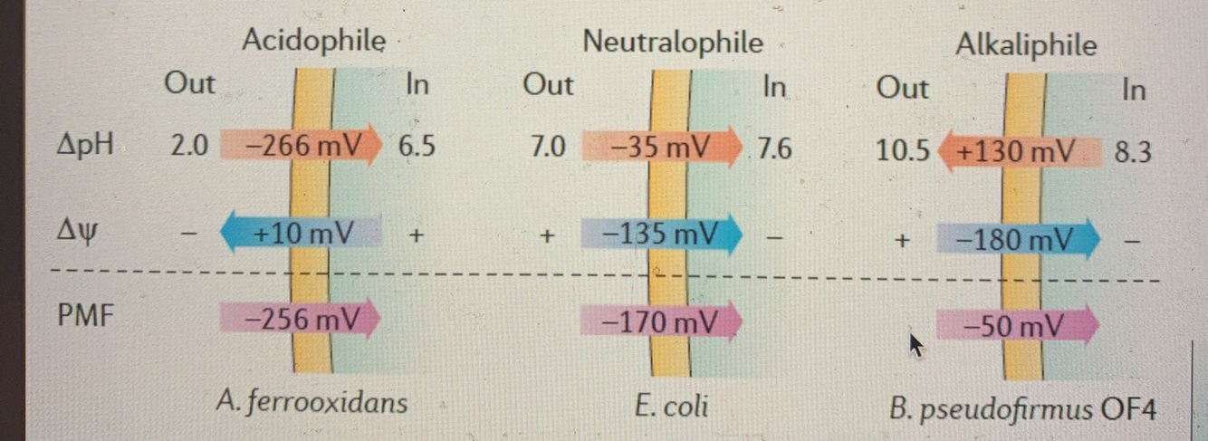 alcalophiles augmentent le potential membranaire Δψ, pour compenser le ΔpH inversé.