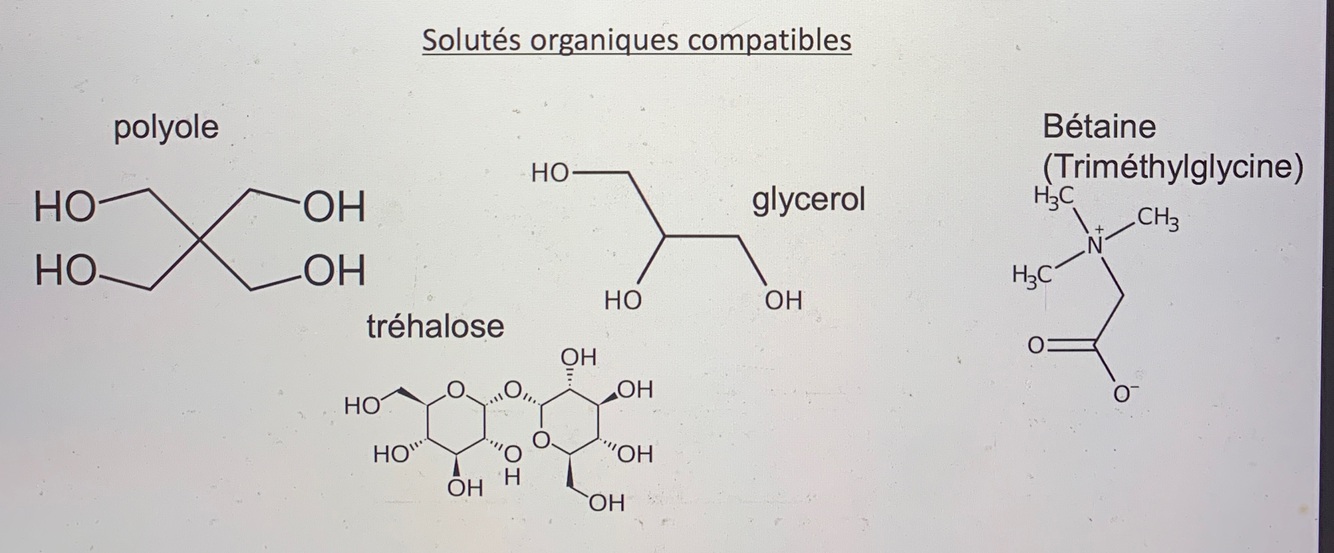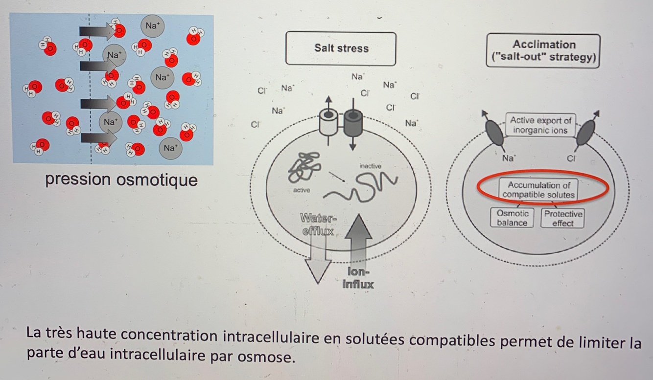 1) Accumuler des solutés organiques compatibles pour contrer et compenser la perte d’eau due à la pression osmotique —> sont synthétisés dans la cellule