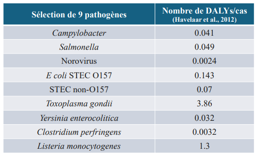 Calcul du fardeau sur la santé: Le modèle utilise les DALYs (Disability-Adjusted Life Years - années de vie corrigées de l’incapacité) comme unité pour mesurer l’impact total des maladies d’origine alimentaire sur la santé humaine.