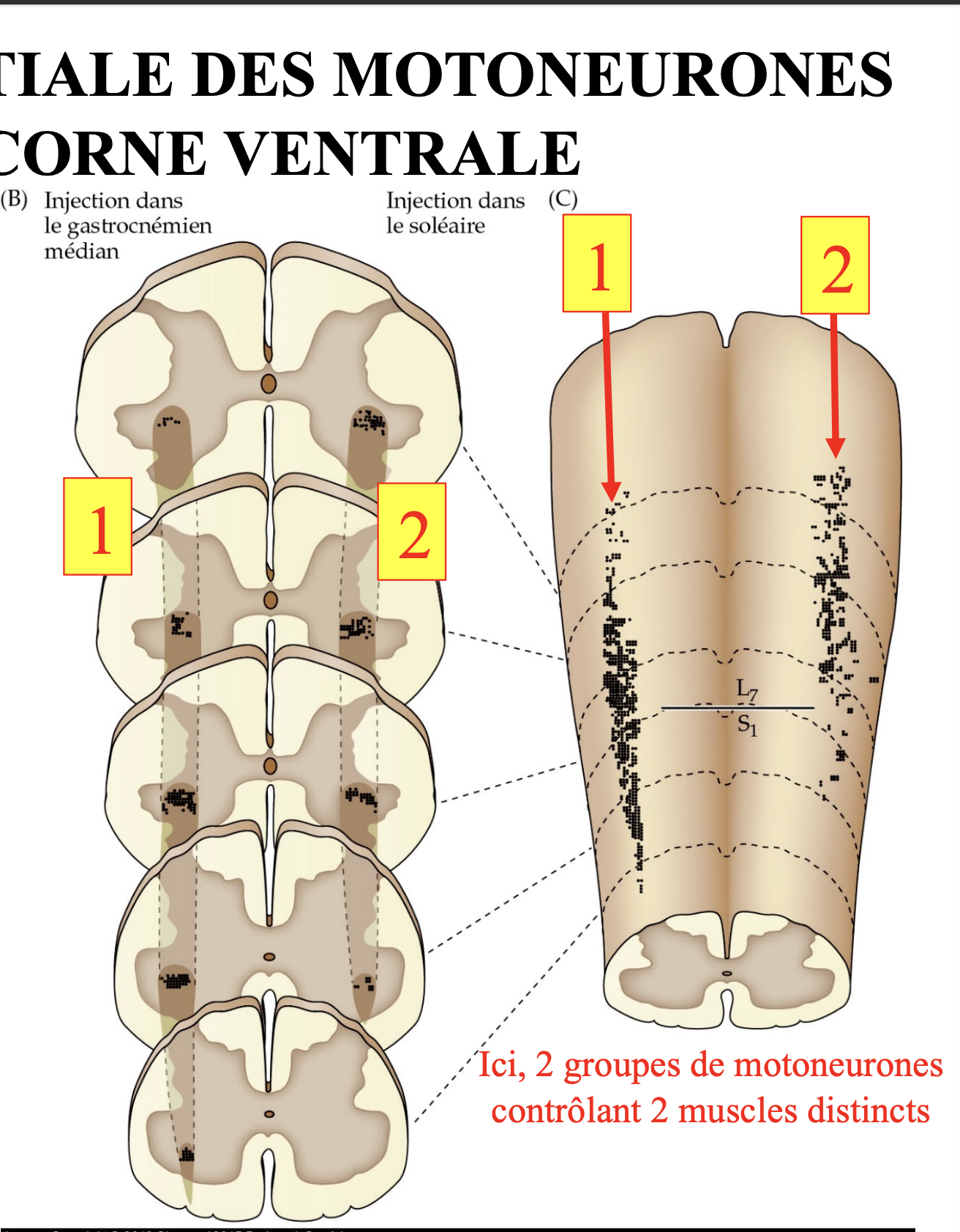 Les groupes de motoneurones qui innervent les muscles proximaux sont localisés dans la (1) et ceux innervant la partie distale sont situés dans la (2).