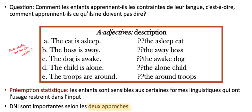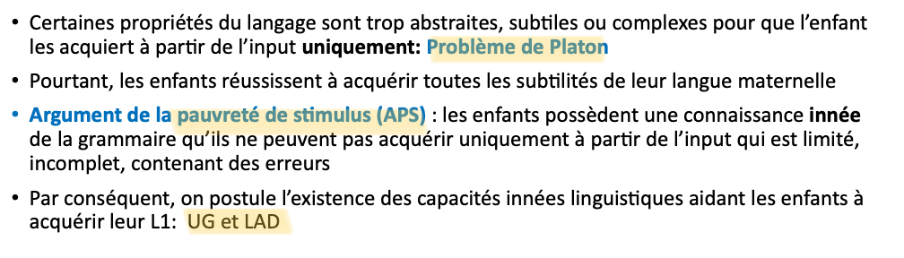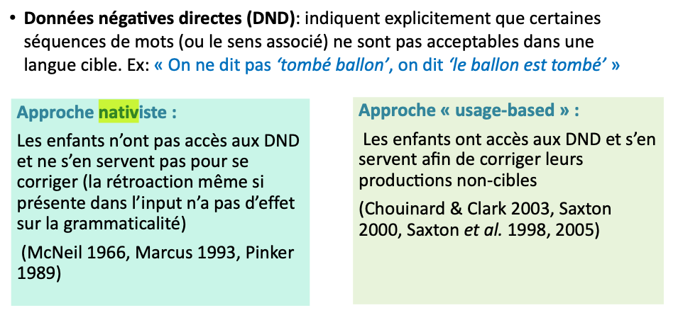 L’input auquel les enfants ont accès est souvent dégénéré = il con6ent des pauses, des hésita6ons, des phrases incomplètes, des phrases avec des erreurs gramma6cales, etc.