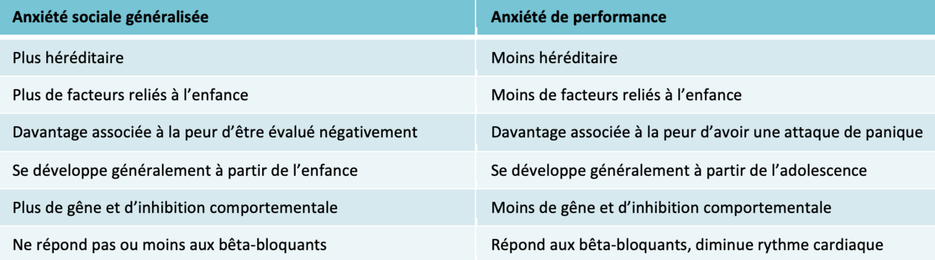 Tableau Anxiété sociale généralisée VS Anxiété de performance