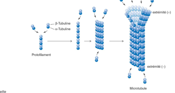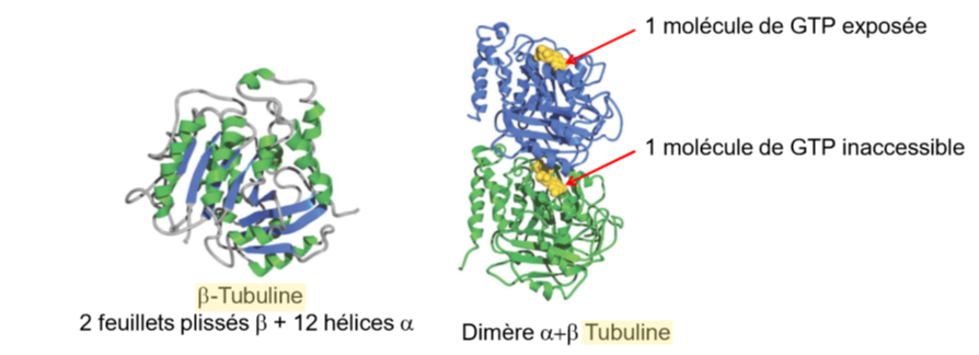 les dimères de tubuline et elles sont liées par une molécule de GTP