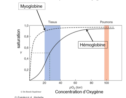 petite concentration de O2 dans les muscles donc myoglobine avec sa forme hyperbolique est saturée meme à faible concentration.