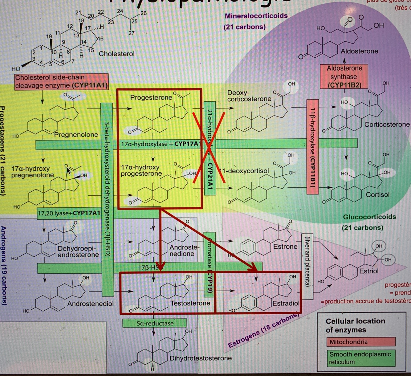—> accumulation de progestérone , prend voie alterne = surproduction de testostérone & oestradiol
