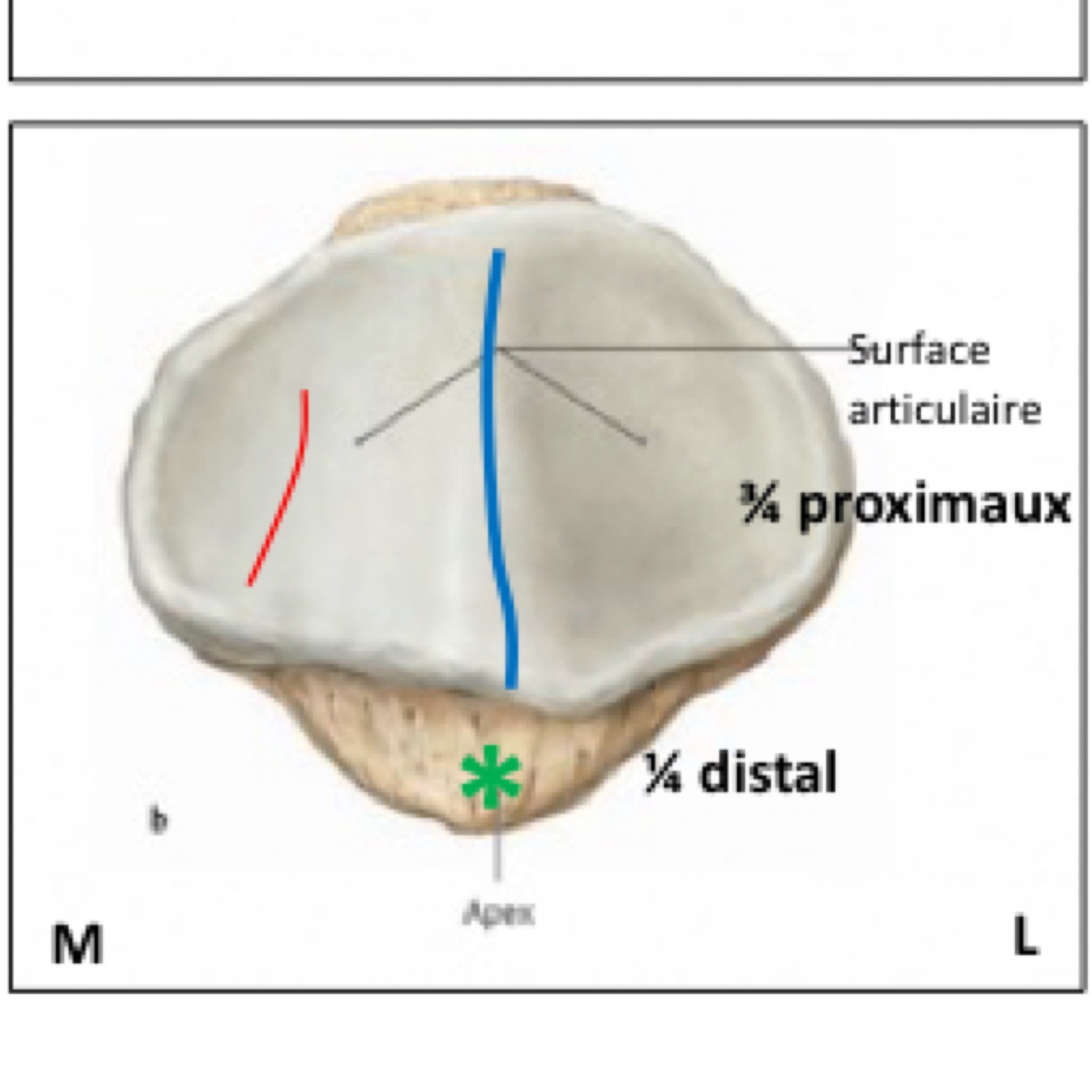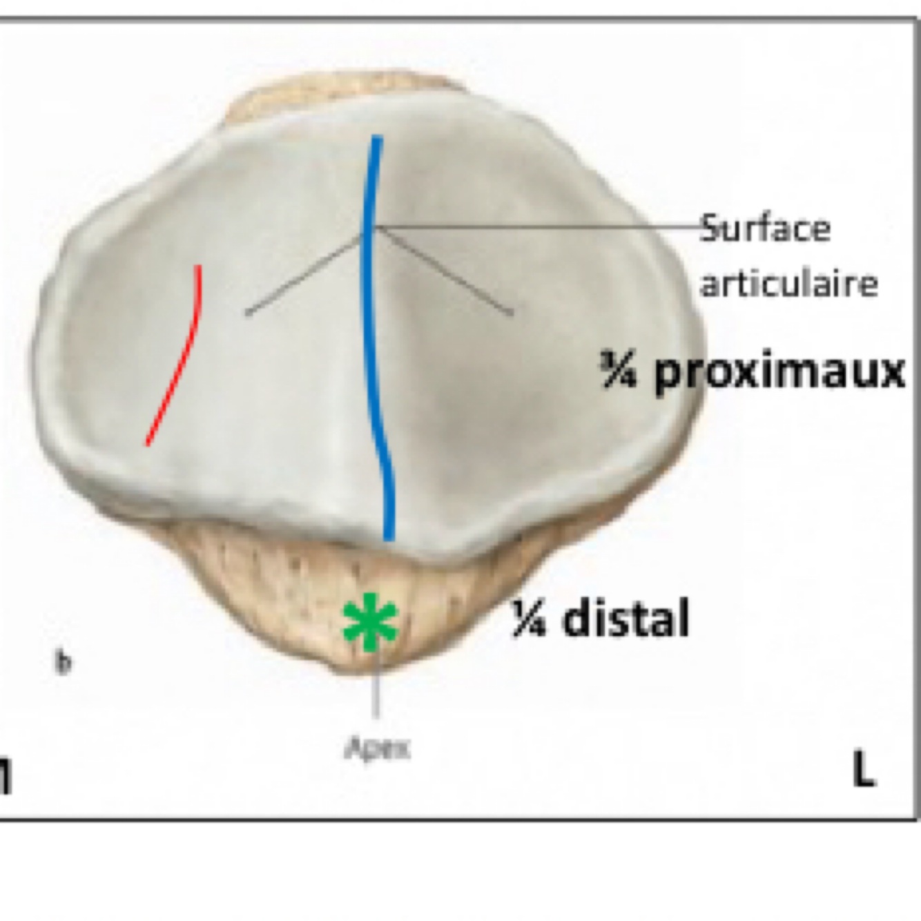 Faux, Le quart distal est non articulaire et correspond à la face postérieure de l’apex patellaire