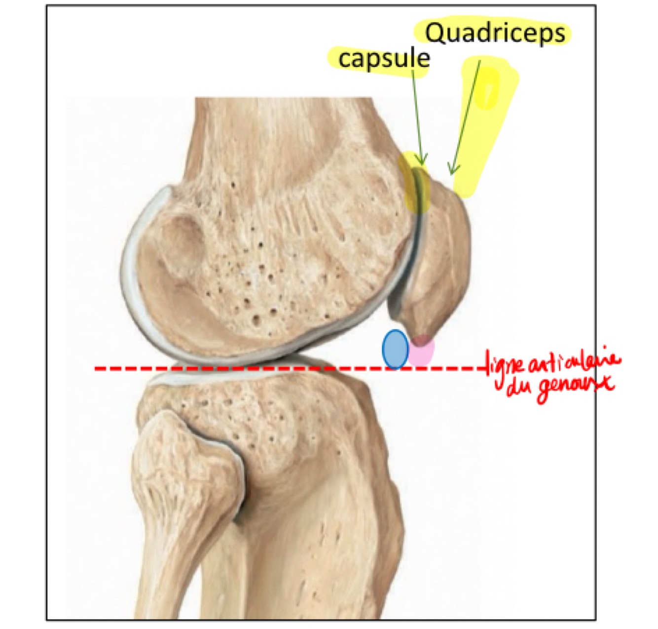 Ppsssttt…Il est proximal à l’interligne articulaire du genoux (en rouge) et sa face postérieure répond au corps adipeux infrapatellaire (en bleue)