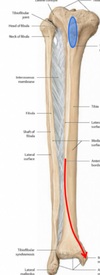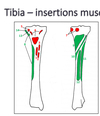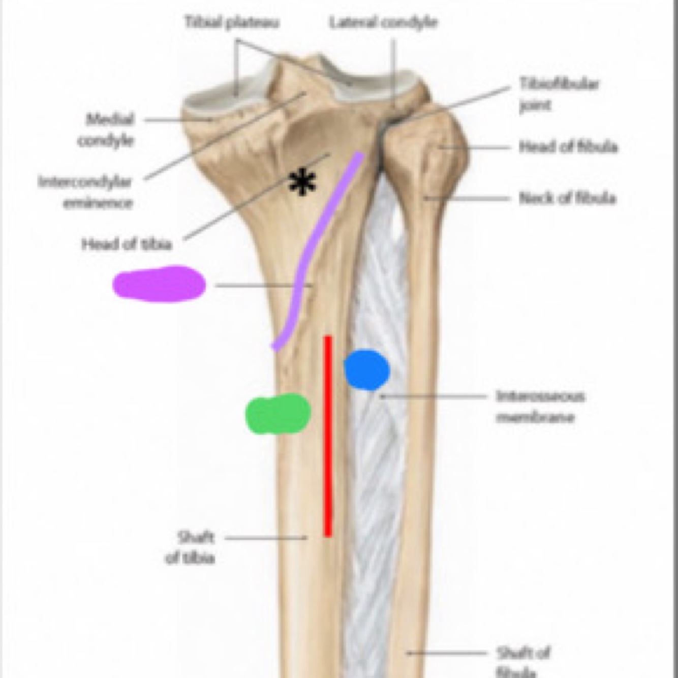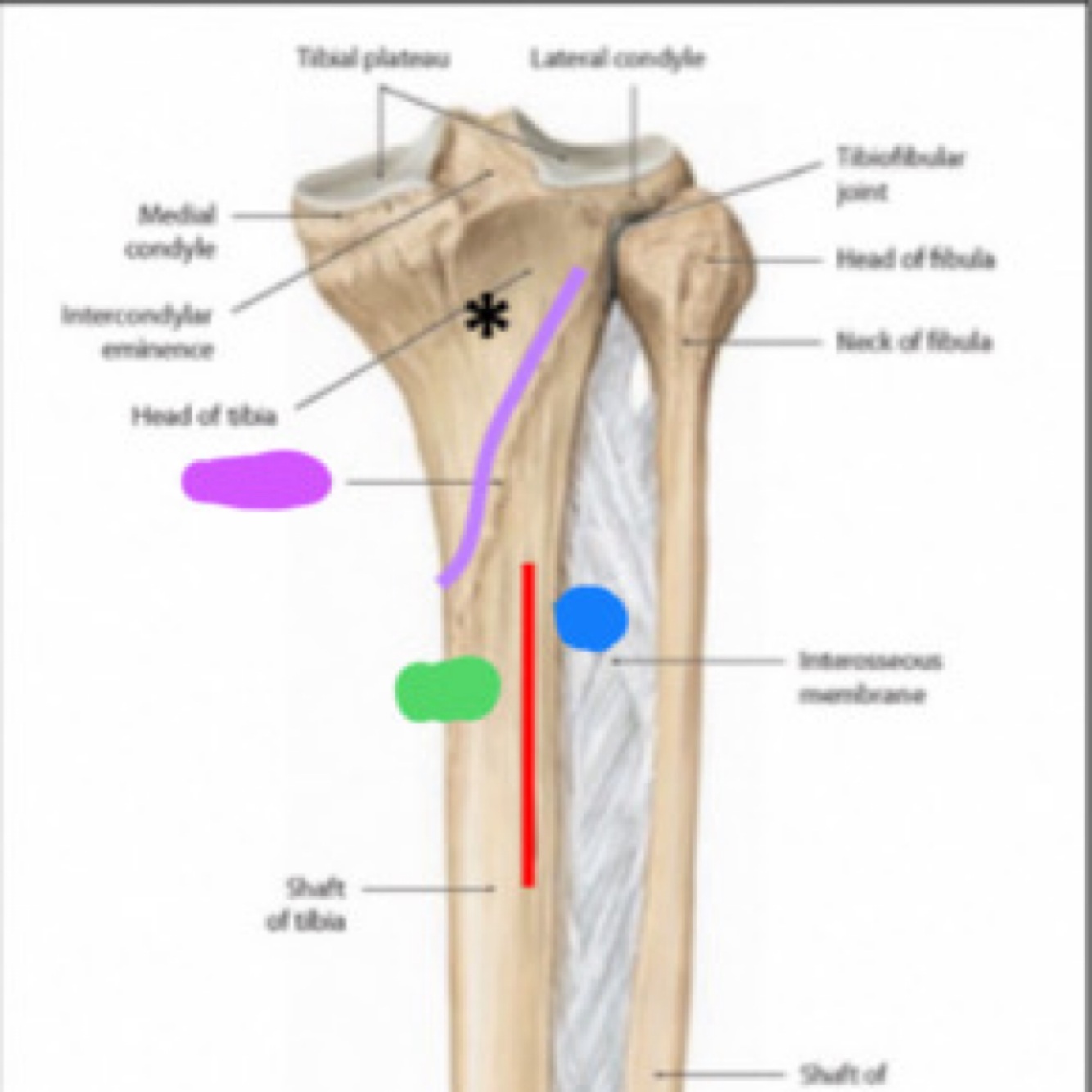 La ________(rouge) sépare la diaphyse de la face postérieure du tibia pour 2 structures (bleu et vert).