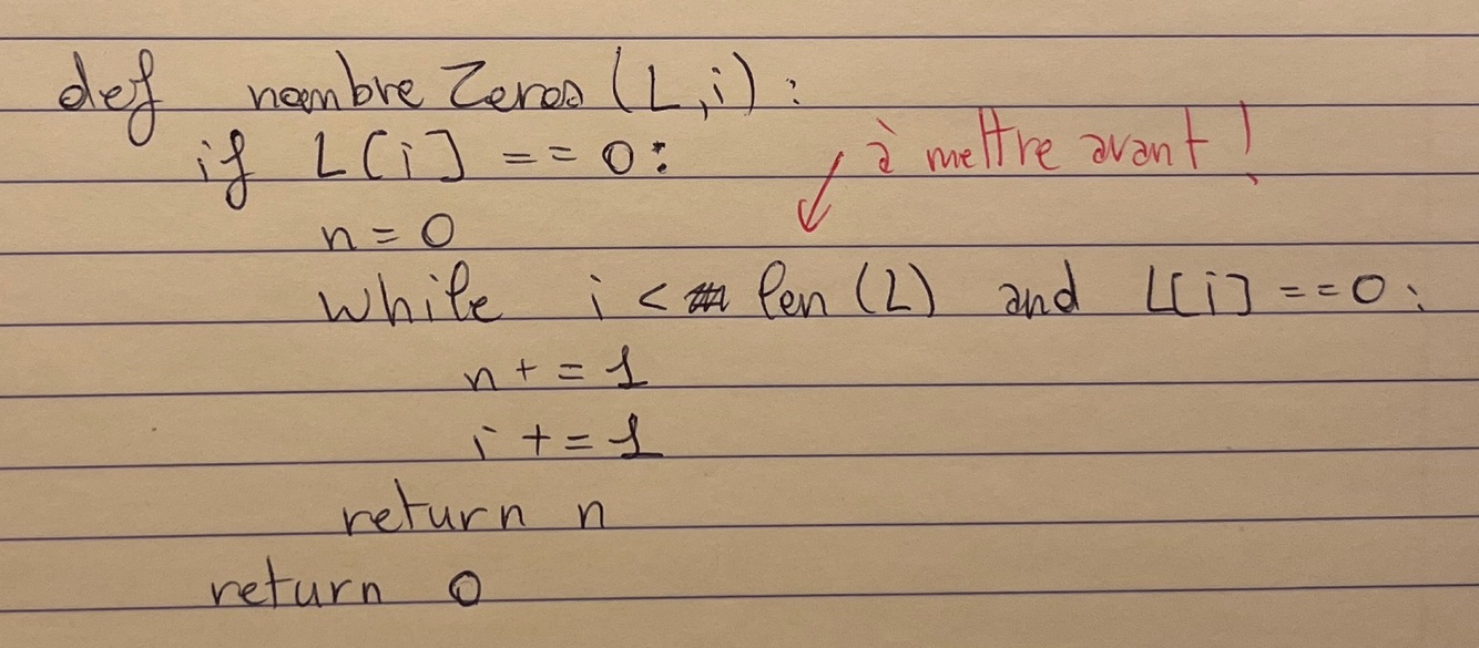 Écris une fonction nombreZeros(L,i) qui prend une liste L, un indice i compris entre 0 et n-1 et retourne 0 si L[i] = 0 ou le nombre consequtifs de zéros dans L à partir de L[i] si L[i] = 0