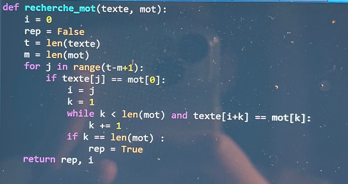 Fais une fonction recherche_mot(texte,mot) qui renvoie si le mot est présent dans le texte et l’incide de la première lettre de mot dans le texte