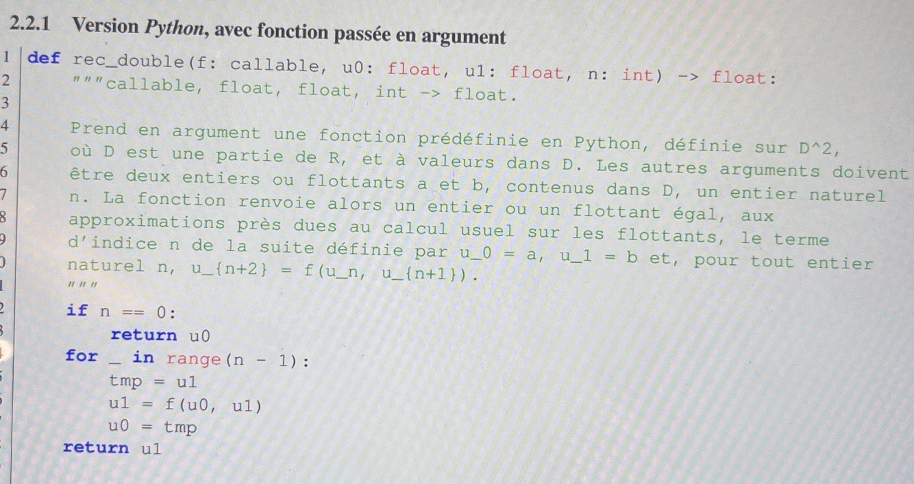 Écrire une fonction rec_double qui prend en argument une fonction f qui définie une récurrence double, u0, u1 et n) qui renvoie le nième terme de la récurrence
