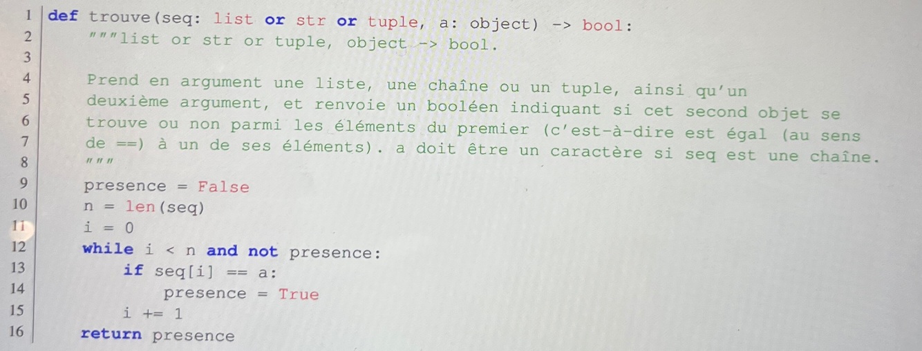 Écrire une fonction trouve qui prend en argument seq une liste et a qui renvoie True si l’élément a est présent sans seq et False sinon. Pour quels autres objets qu’une liste cette fonction peut elle continuer à fonctionner ?