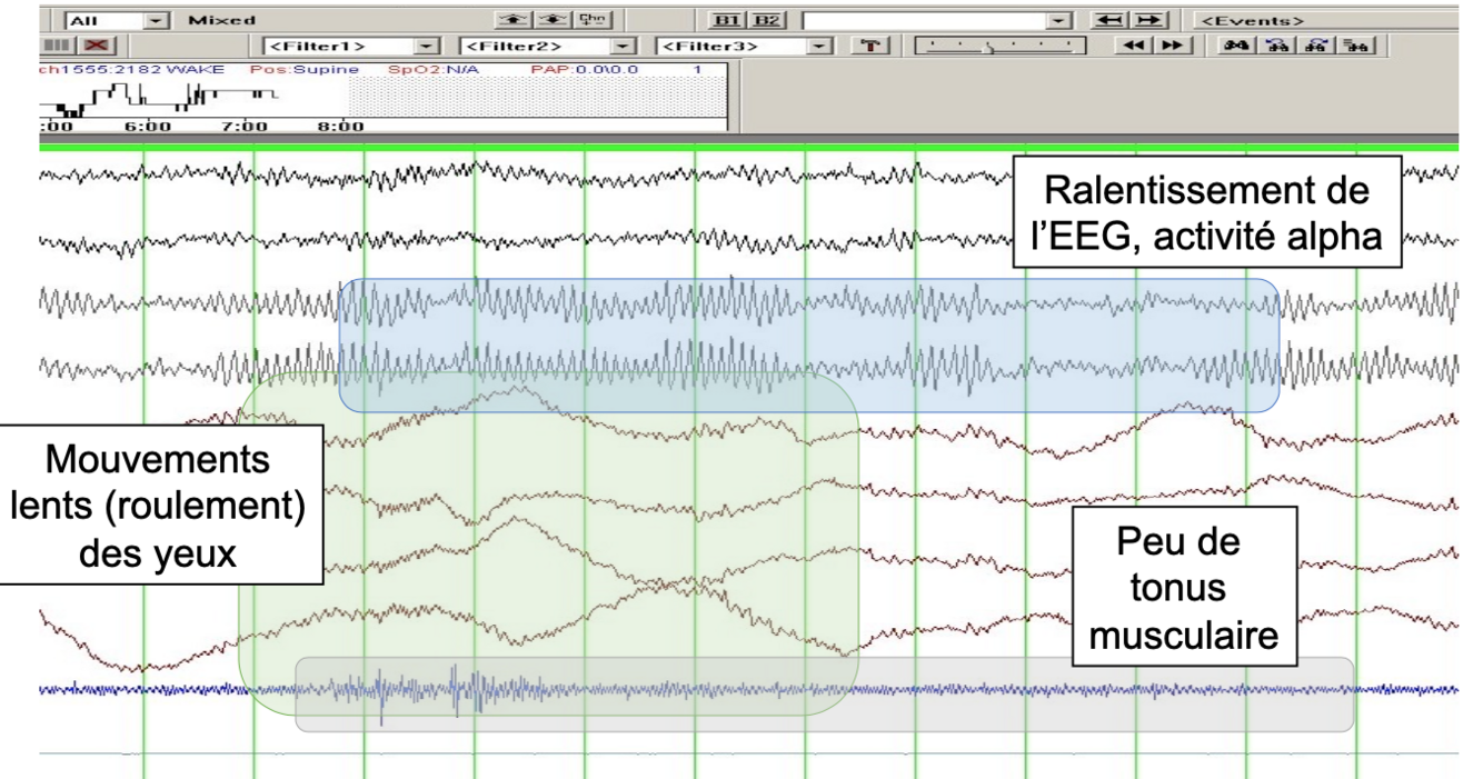 Cet état établit la frontière entre le sommeil et la veille mais Il est difficile de situer le moment exact de l’endormissement, c’est plutôt un processus graduel… (certaines aires du cerveau s’endorme avant d’autres)