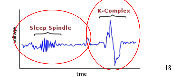 b) complexes K (on les voit uniquement pendant sommeil, jamais eveillé): une grande onde bipolaire qui traduiraient en une réaction aux stimuli extérieurs; préservation du sommeil (‘porte’ thalamo-corticale) (on reste eveillé malgré stimuli grace a ca)