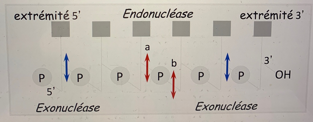 Exo: libèrent par hydrolyse le nucléotide situé à lʼextrémité 5ʼ ou 3ʼ