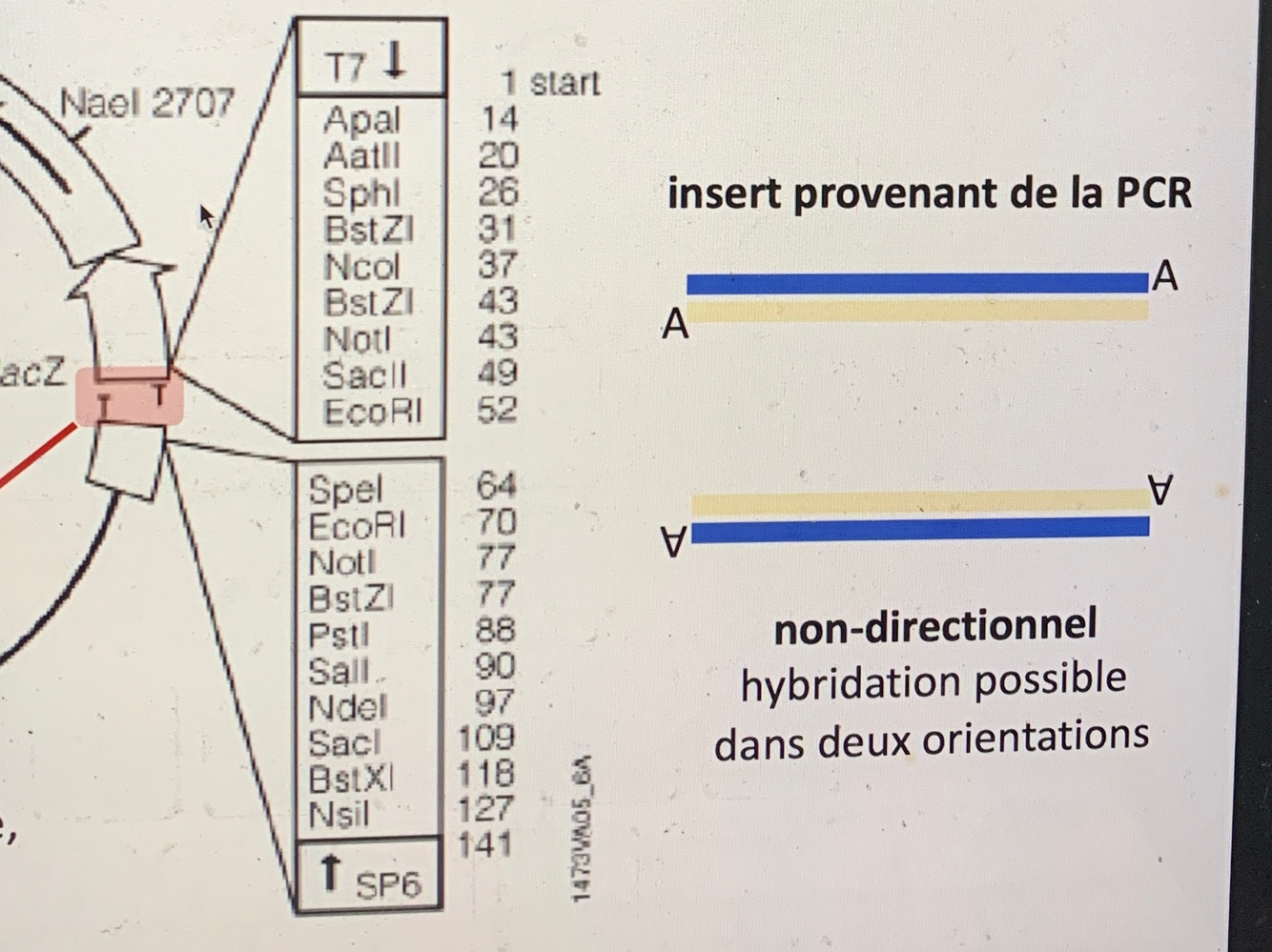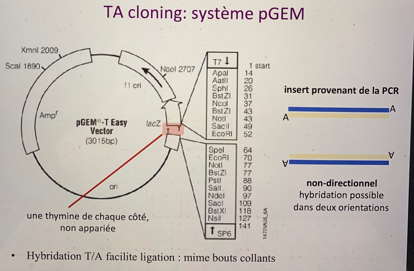—> vecteurs pGEM avec extrémités thymines (T) complémentaires aux extrémités adénine (A) de l’insert PCR