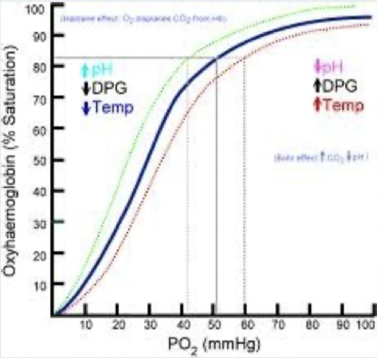 Pour une PO2 donnée, la saturation de l’Hb en O2 est réduite et elle libère plus facilement l’O2 à l’exercice: risque de désaturation