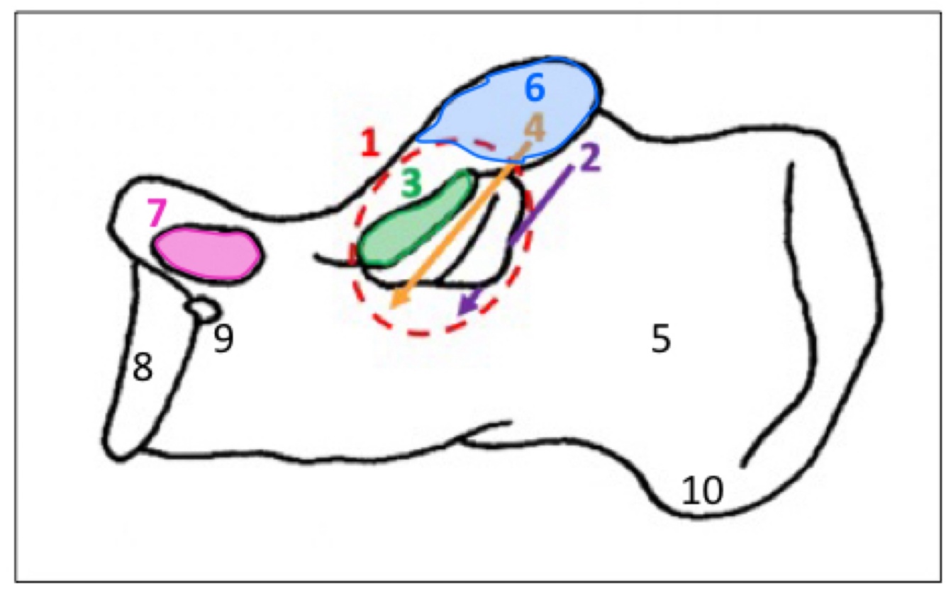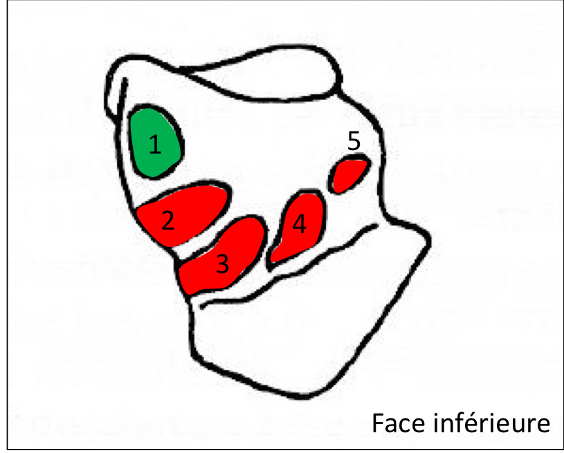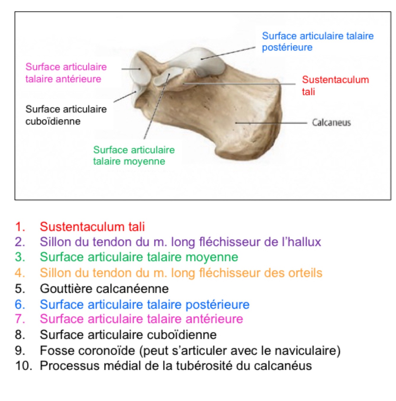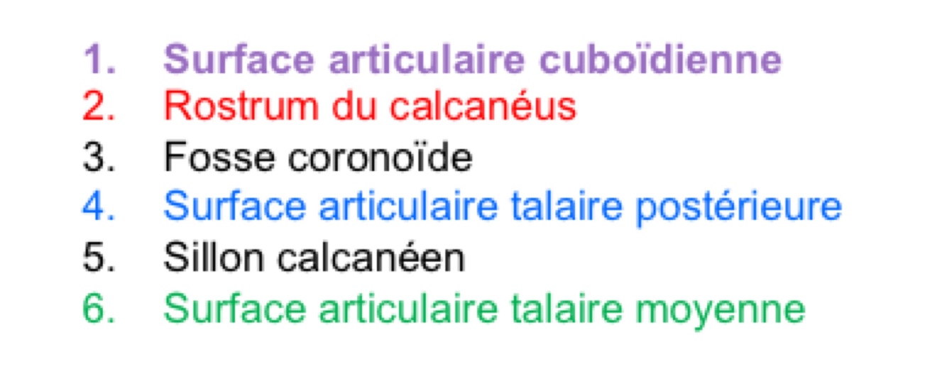 1-La surface articulaire talaire postérieure peut présenter trois extensions facettaires : antérieure (6% des cas), postérieure (6% des cas), médiale (5% des cas)
