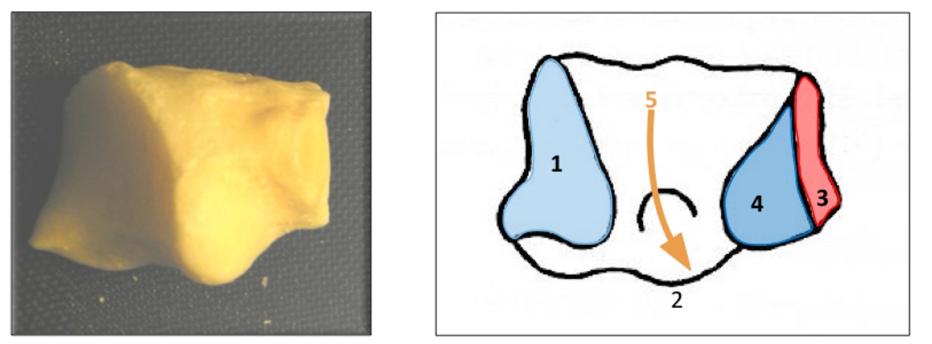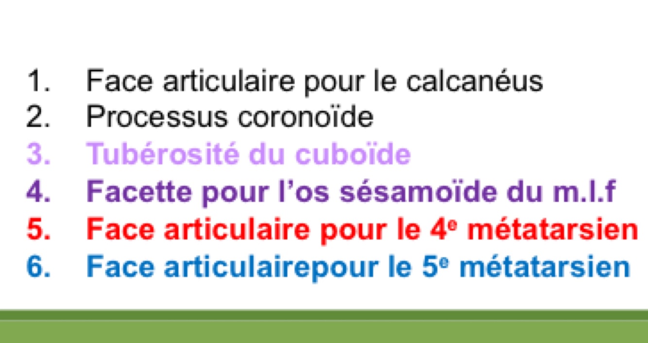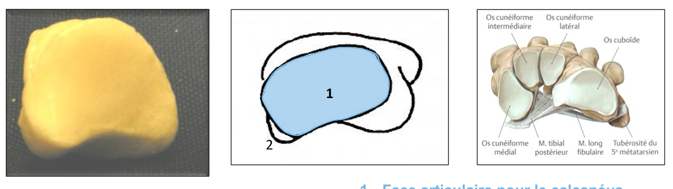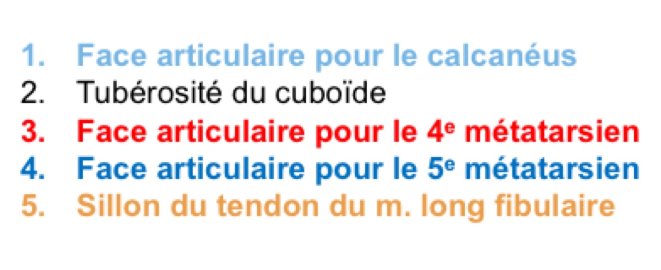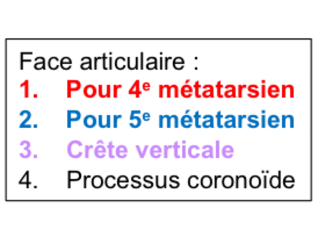 Nomme l’os qui s’articule avec le 3e et 4e métatarsien et ses reliefs