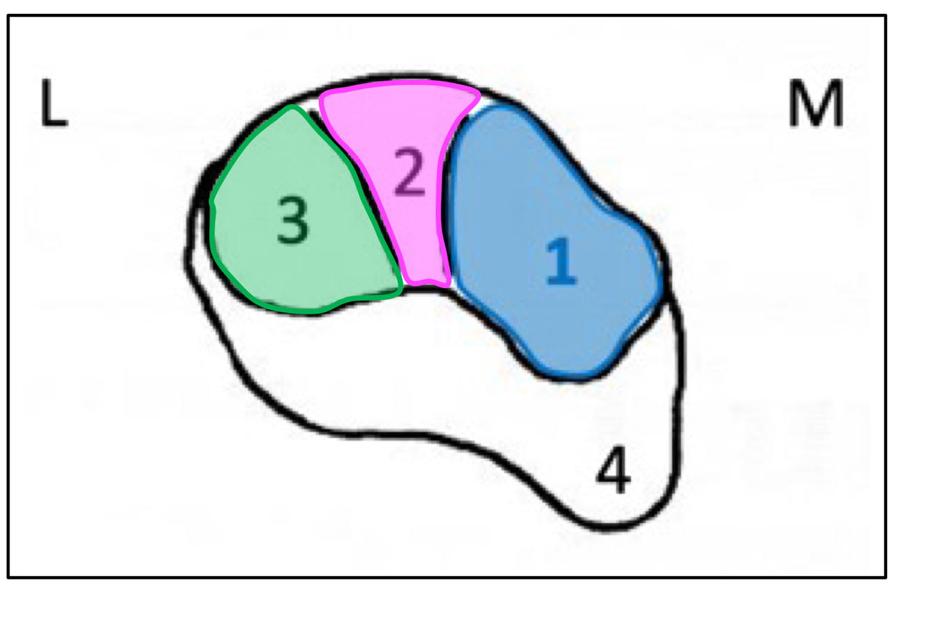 La surface articulaire pour le cunéiforme intermédiaire est triangle à base inférieure, plane ou légèrement concave