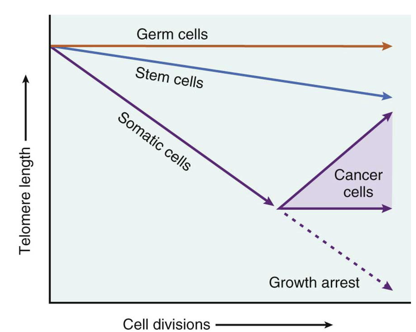 Après un nombre fixe de divisions cellulaires, elles atteignent un état terminal sans capacité de division = fin raccourcissement des télomères (bout ADN non-codant à la fin des extrémités de chaque CR). signifie dommages à l’ADN à la ¢ et donc arrêt cycle cellulaire