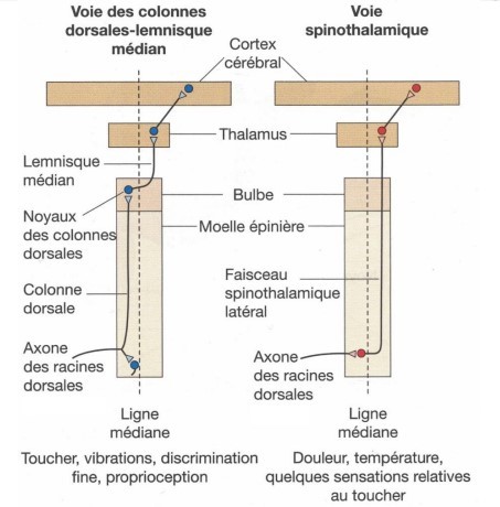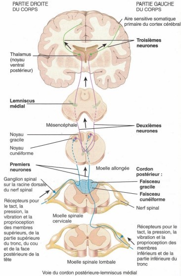 – Le tact, la pression, les vibrations et la proprioception consciente des membres supérieurs, de la partie supérieure du tronc, du cou et de la face postérieure de la tête.
