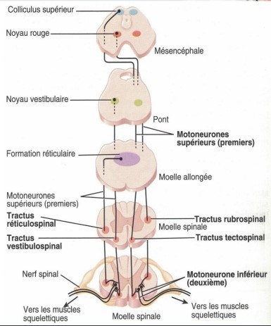 - Des noyaux vestibulaires (qui reçoivent des informations sur les mouvements de la tète venant de l’oreille interne) vers les muscles squelettiques ipsilatéraux du tronc et des parties proximales des membres pour maintenir la posture et l’équilibre en réponse aux mouvements de la tête.