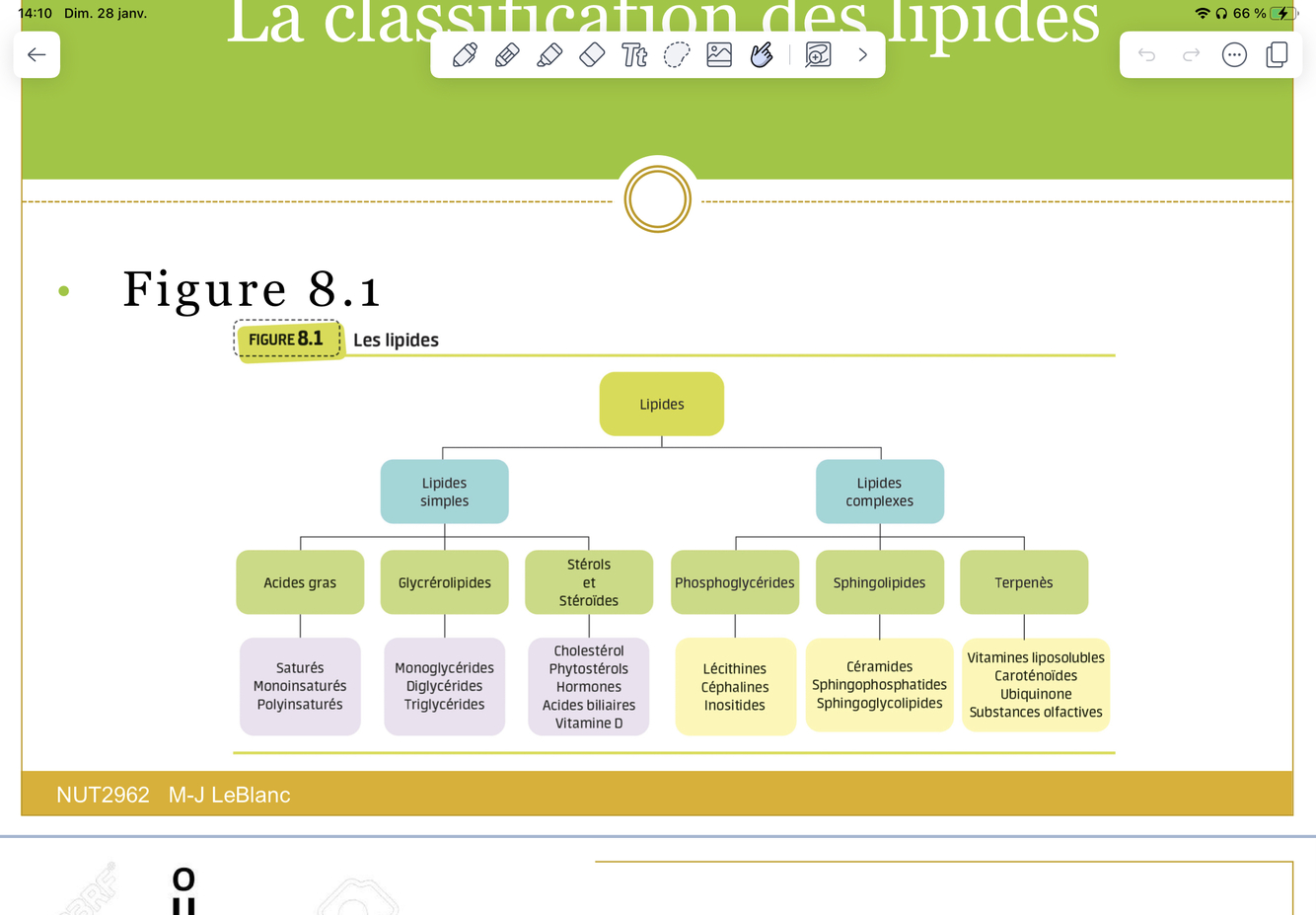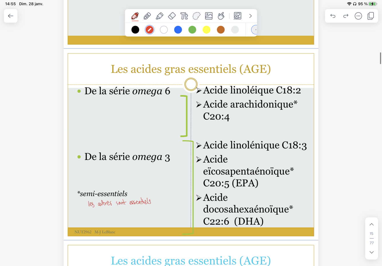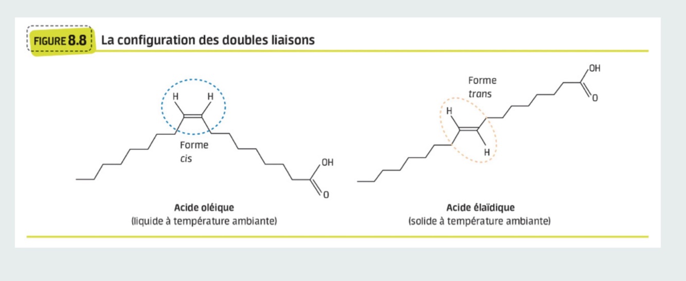 les acides gras se différencient donc pas le nbre de C et liaison double, car les atomes de C peuvent etre soient saturés par 3 atomes de H ou 2 si liens doubles)