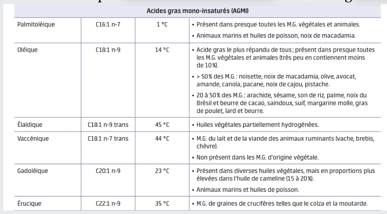 Acide myristique (14:0) : presque toutes les m.g végétales et animales, beurre cacao, suif, saindoux, huile de palme, huiles végétales et animales