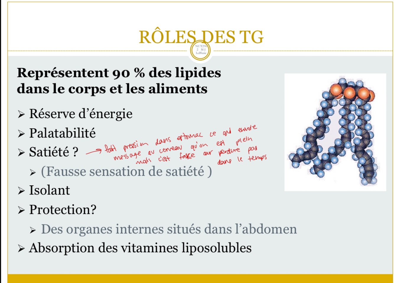 Rôles des TG (voir photo) c’est pas mal les mêmes que rôles des lipides en général…