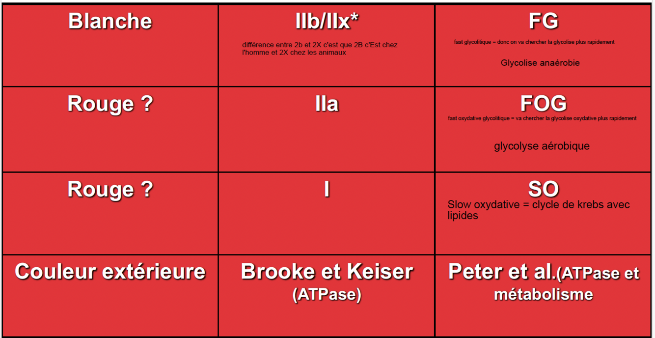 Poulet: utilise beaucoup de fibre FG/2B = fibre qui utilise pas d’oxygène, mais plutôt du glucose. Donc couleur blanche.