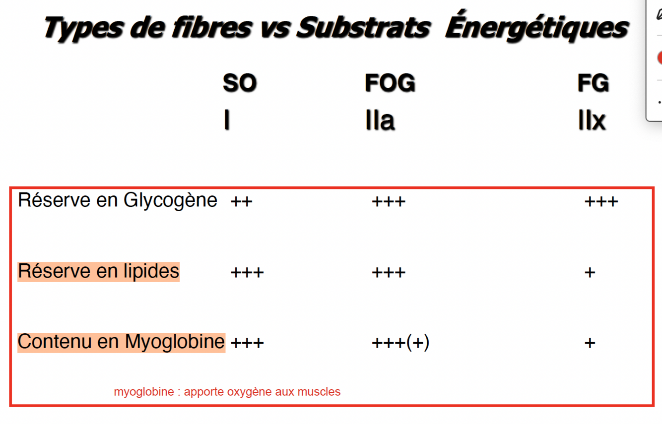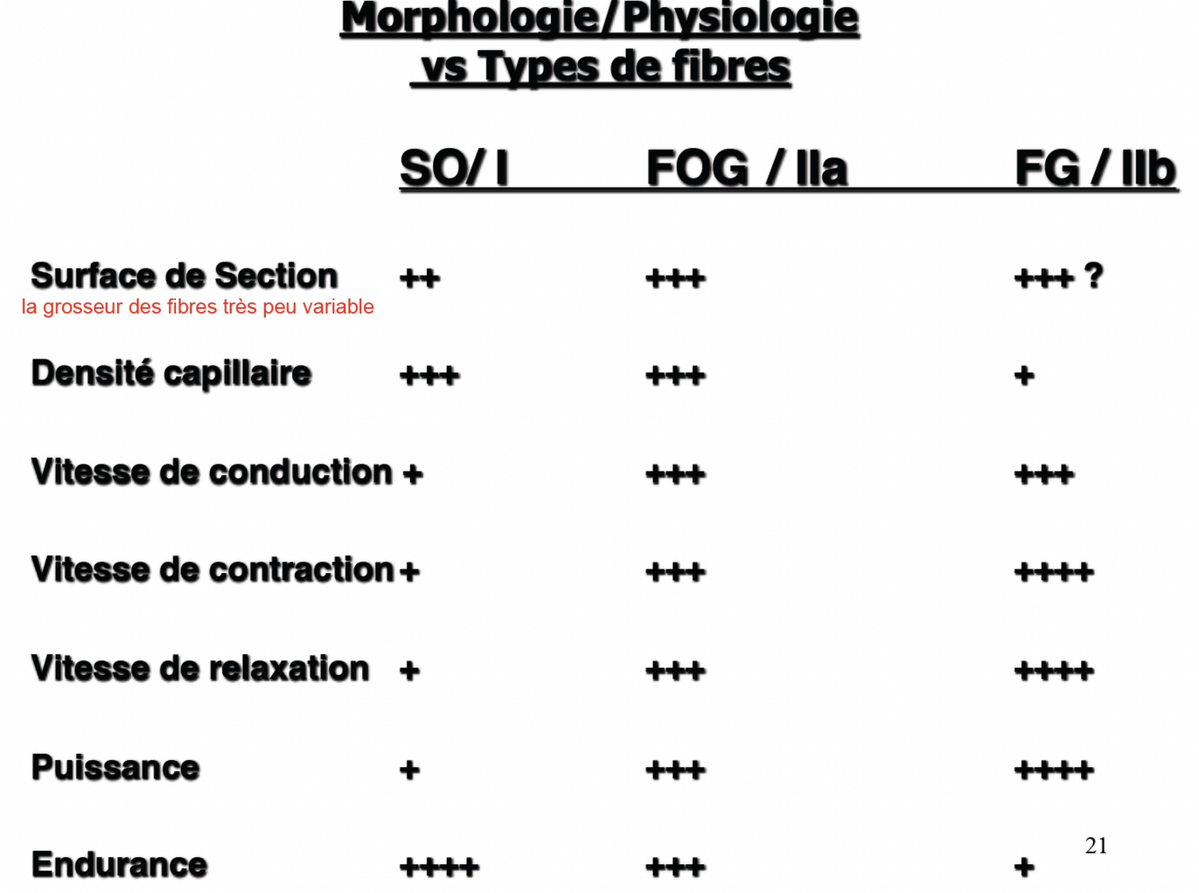 Capacité glycolytique: SO/1, FOG/2A, FG/2B