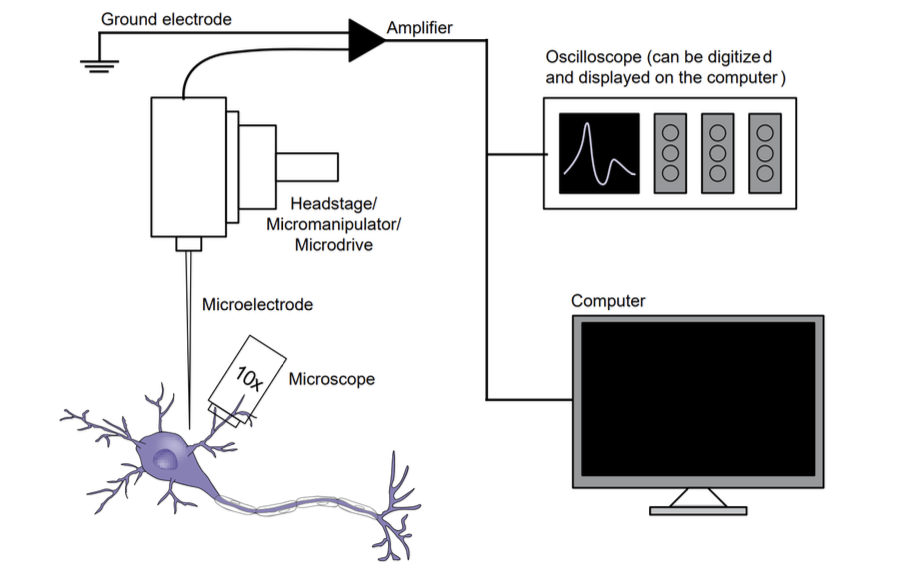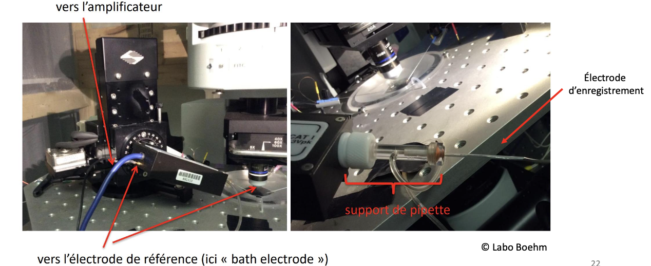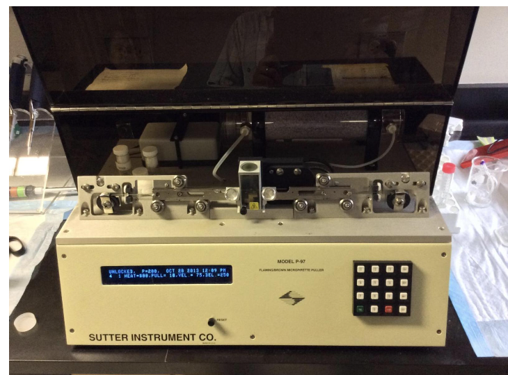 fait les microélectrodes pour enregistrement intra et extra en chauffant et étirant les capillaires de verre produisant des pointes très fines ( moins de 1 um)
