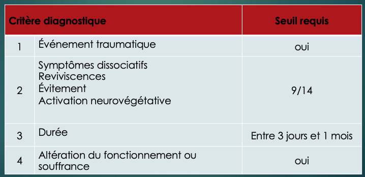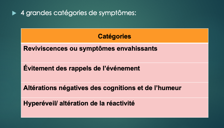 Symptômes dissociatif, reviviscence, évitement, activation neurovégétative (9/14)