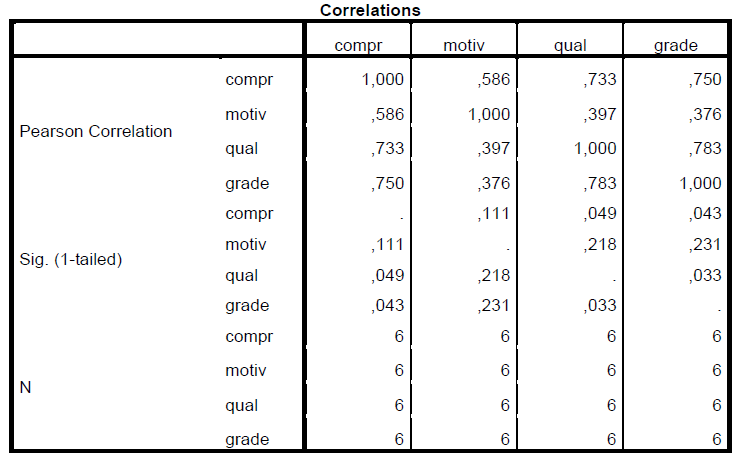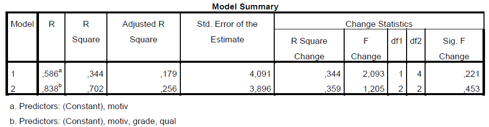 Ce sont des corrélations, pas des % ! Donc, si on veut avoir les SR2 (% de variance expliqué), il faut les mettre aux carré. Ici, Motiv (.291 au carré = .09), Qual (.178 au carré = .03), Grade (.248 au carré = .06) doivent être additionnés et leur contribution unique sera de 18%.