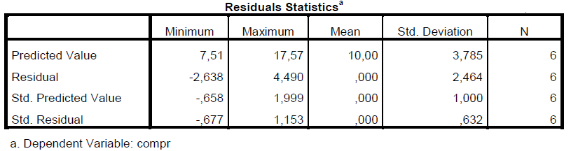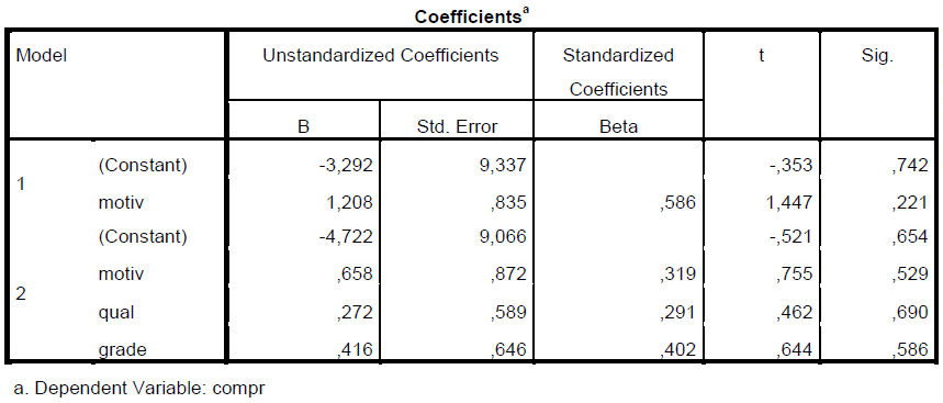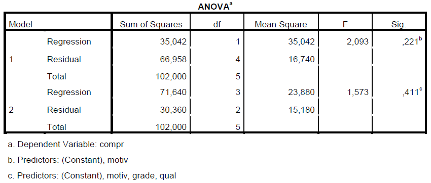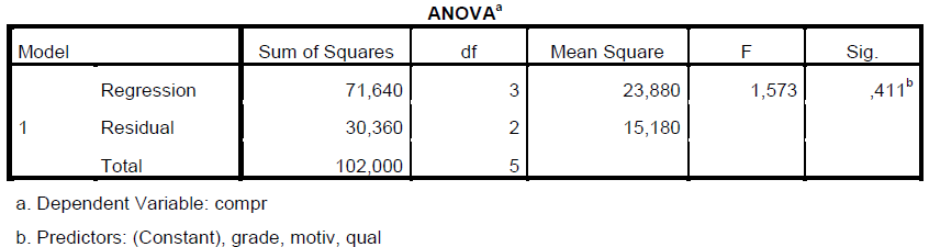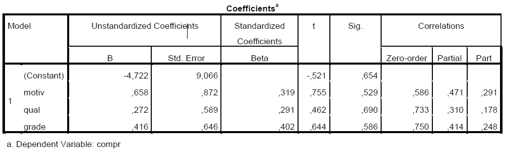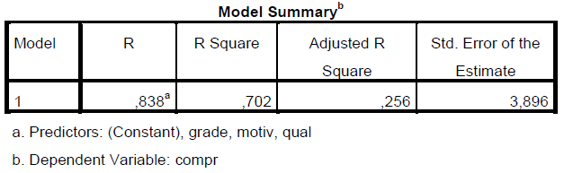 Ici notre modèle prédit 17.57 pour compr (18) si motiv est 14, grade est 19 et qual est 19 (voir base de donnée SPSS)