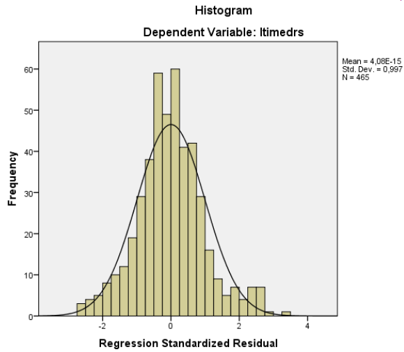 Histogramme des résidus standardisés de la variables dépendantes (Indice: Histogramme centré à 0, un résidu est centré à 0).