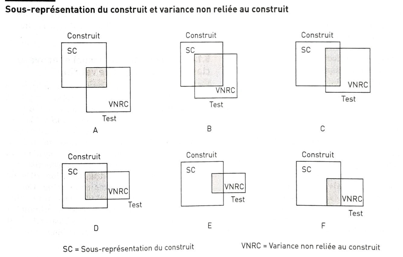 L’intersection du construit et du test représente la validité: le test mesure ce qu’il est censé mesurer. La partie du construit qui n’est pas couverte par le test est appelée sous-représentation du construit.
