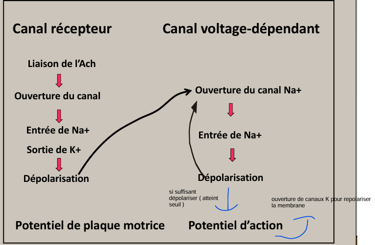 Expliquez la chaine d’évènement d’un canal métabotrope ( Du potentiel de plaque motrice au potentiel d’action)
