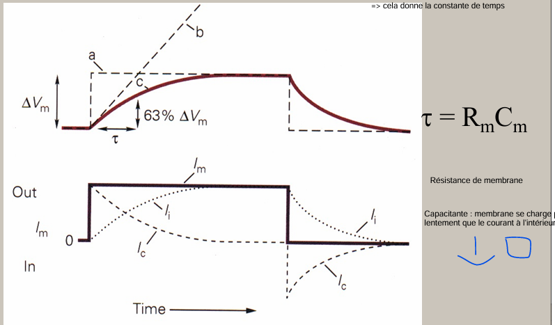 Quand un courant arrive dans le neurone, il ne modifie pas instantanément le potentiel de membrane.
