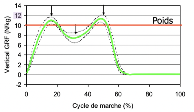 Quels sont les deux sommets dans la courbe de forces de réaction verticales?