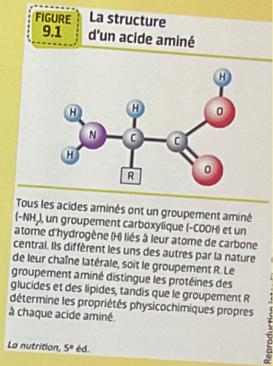 Atomes de carbone lié à des atomes d’hydrogène avec 3 groupement: groupement carboxylique (-COOH) et groupement aminé (-NH2) et un groupement R (chaîne latérale)