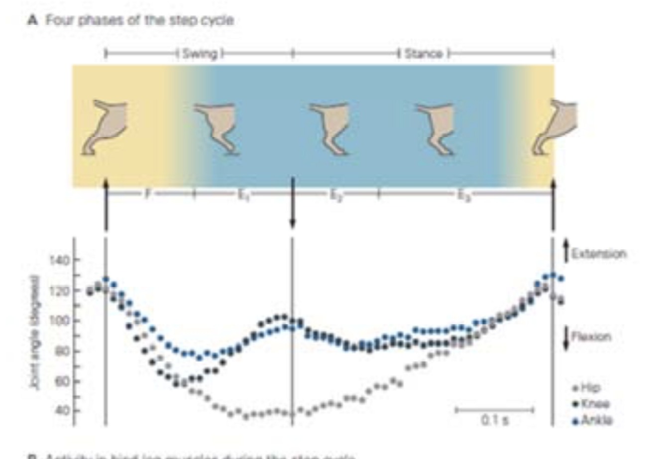1.phase de balancement (swing, quand pied est en l’air) : divisé en F (flexion) et E1 (première extension)
