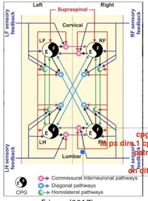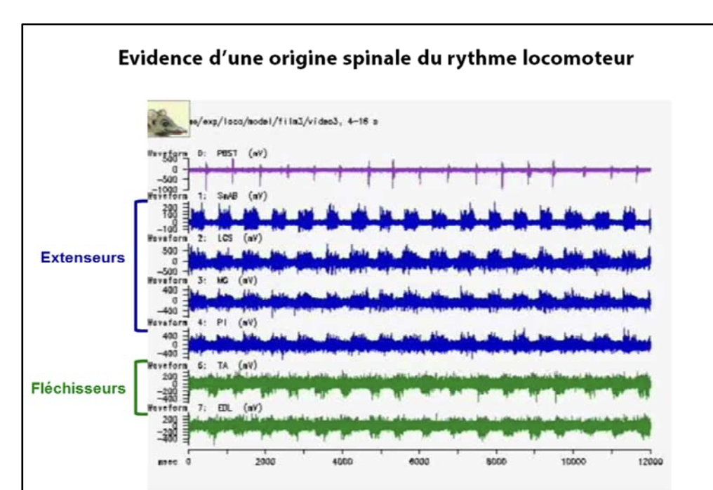 locomotion : activité est alterné entre muscle agonistes (fléchisseurs/extenseurs) d’un coté et muscles antagonistes gauche /droit
