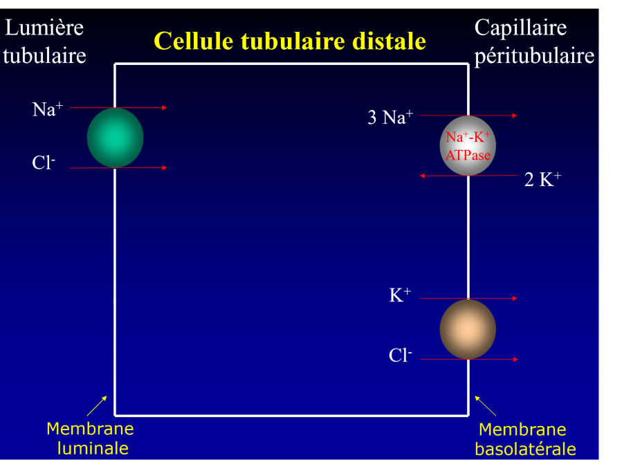 dans le tubule distale, quelle substance entre dans la cellule du côté luminale