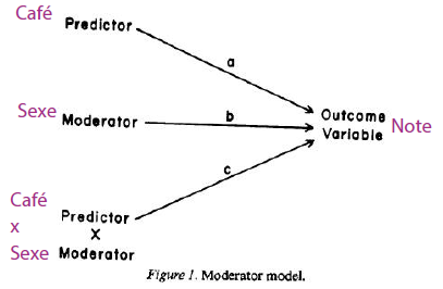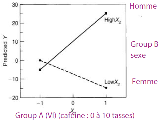 Qu’est-ce qu’on interprète de ce graphique? Il y a une interaction (car les droites se croisent)! Plus on consomme de la cafféine, plus les hommes ont du succès mais c’est contraire pour les femmes. Donc le genre vient modérer la relation entre la caféine et le succès. Le contexte du genre sera alors important dans notre interprétation des résultats.