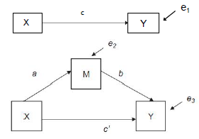 où i = intercept, M = médiateur, X = VI, Y = VD et e =