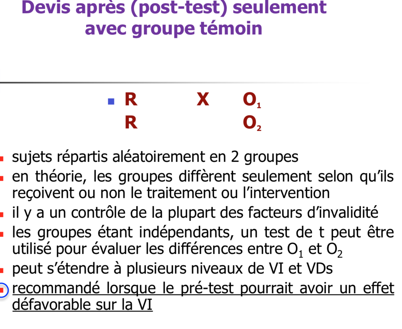 • Utilisée lorsqu’on cherche à vérifier l’effet d’une VI (intervention ou traitement) sur une VD.